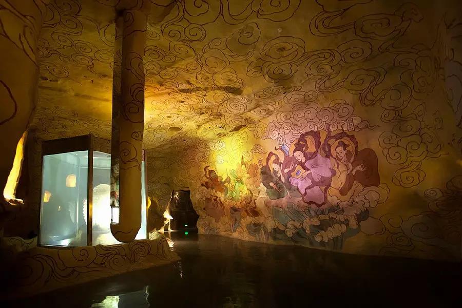 走到这里视线顿时豁然开朗,可以看到黄色光芒充满整个空间,非常具有殿堂般的神圣感! 震撼的是墙上布满的壁画,全部都是手工绘制的!