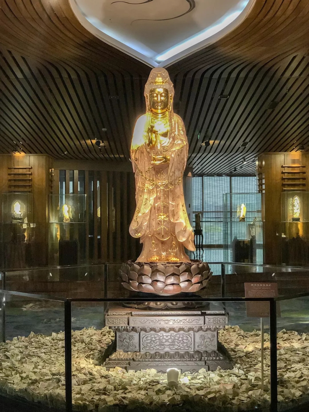 中央的就是这座用巨型天然粉色水晶配上鎏金工艺雕刻的观音雕像,给人一种神圣威严的感觉。